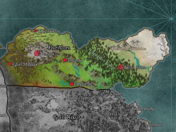 The Edgegrave Forest is an enchanted wood patrolled by the fey. It is said that an ancient elvish stronghold, Belan Alora, once presided over much of this land. It is also said that a greedy prince's deal with the fey turned sour, and now few dare venture beneath the boughs of that dire wood. The forest itself is coniferous, rugged, and the land grows more frigid the farther one travels.