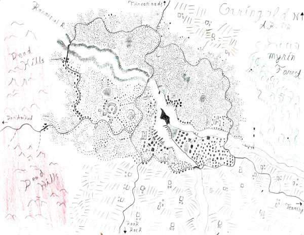 This town is the seat of power for House Oringil. Melting Pot, started by Elves, but many races started building, so the town has a mix of architectural features. Huge park along the river, illegal to build within so many feet of it. There's a giant tower built out of a stone, that looks like it grew out of the stone. Surrounded by Myrin Forest to the northeast, the Dead Hills to the west and south. Vineyards and other farms line the main roads coming in from Rook Rock, Tearshy and Threeroads